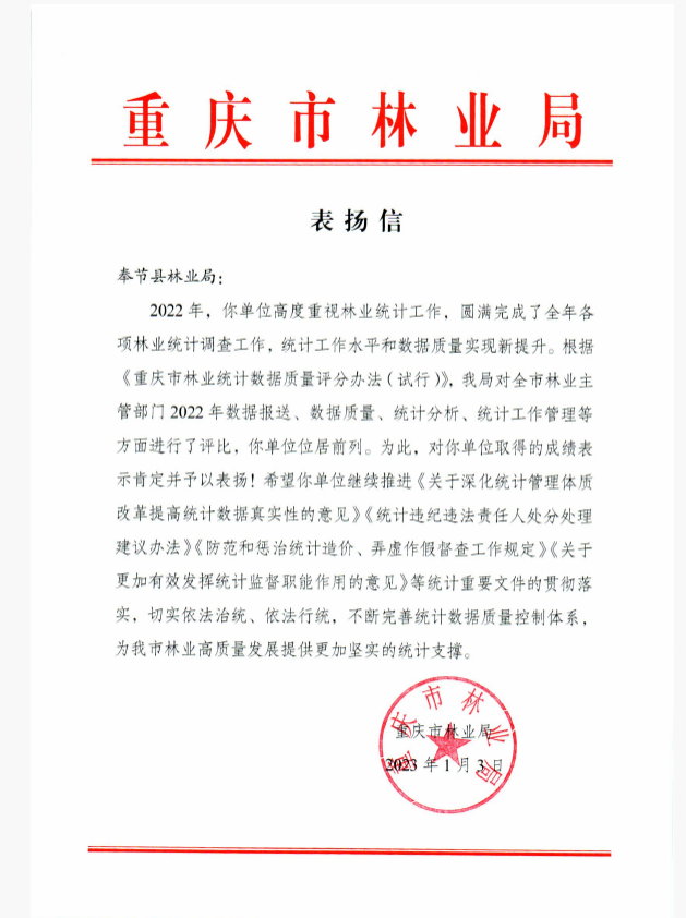 2022年度重庆市林业统计工作考评结果公布,县林业局在数据质量、统计分析、统计管理等方面举措创新、成绩突出,综合得分位居前列,市林业局特发“表扬信”予以肯定和激励。